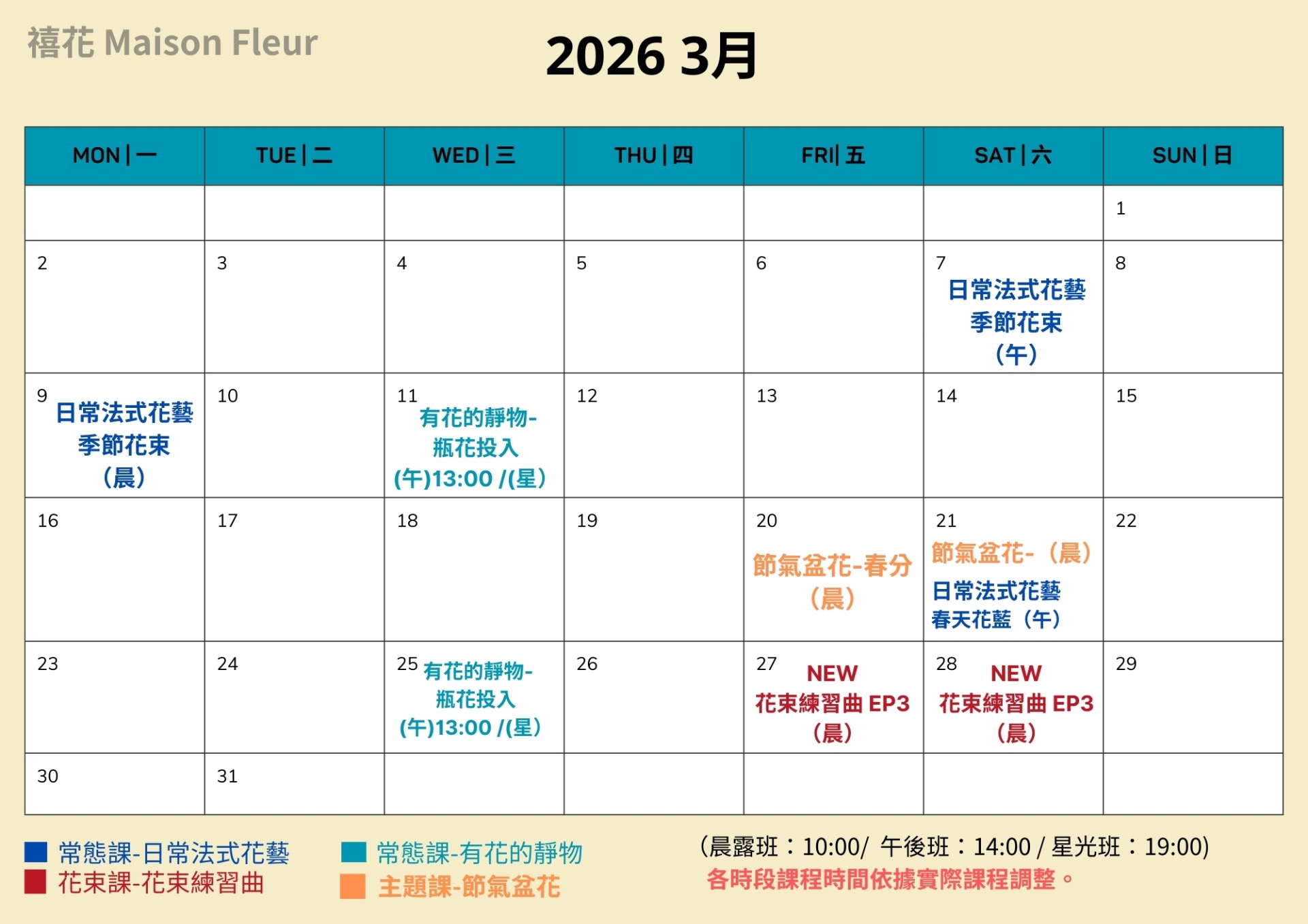 花束課程-花束練習曲 主題課程-節氣盆花 常態課程-日常法式花藝 常態課程-有花的靜物.瓶花投入式