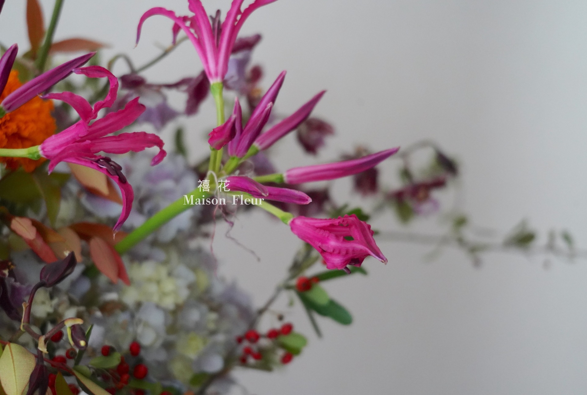 石蒜多生於河岸、田埂與林緣,總在季節轉換的時節悄然綻放。花姿纖細而有力量,帶著時間流動的節奏感,是秋天作品中能展現線條與光影之美的花材之一。